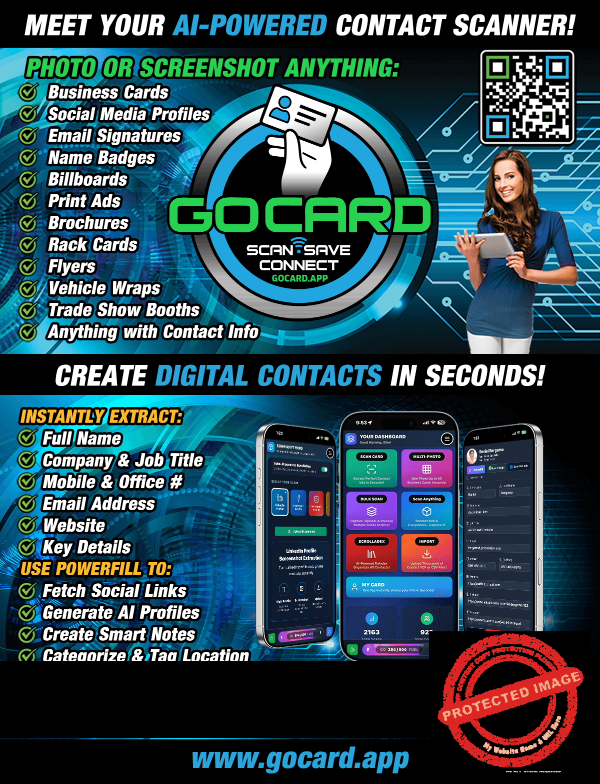 GoCard combines aesthetics with functionality, integrating the “Infinity Engine” to display limitless social icons without overcrowding the precious screen space of smartphones. This design choice ensures that the focus remains on you and your business. Additionally, GoCard’s unique Scrolladex feature notifies you via text message the moment someone connects with your GoCard, organizing their contact details into a secure, searchable format. This innovative approach not only speeds up your response time but also effortlessly converts potential leads into clients. GoCard doesn’t aim to replace traditional paper business cards but to enhance them. Its dynamic GoCode, a customizable QR Code, can be printed on all your marketing materials, allowing prospective clients to access your GoCard instantly. This synergy of traditional and digital means positions GoCard at the forefront of the digital business card industry, ensuring a memorable first impression.